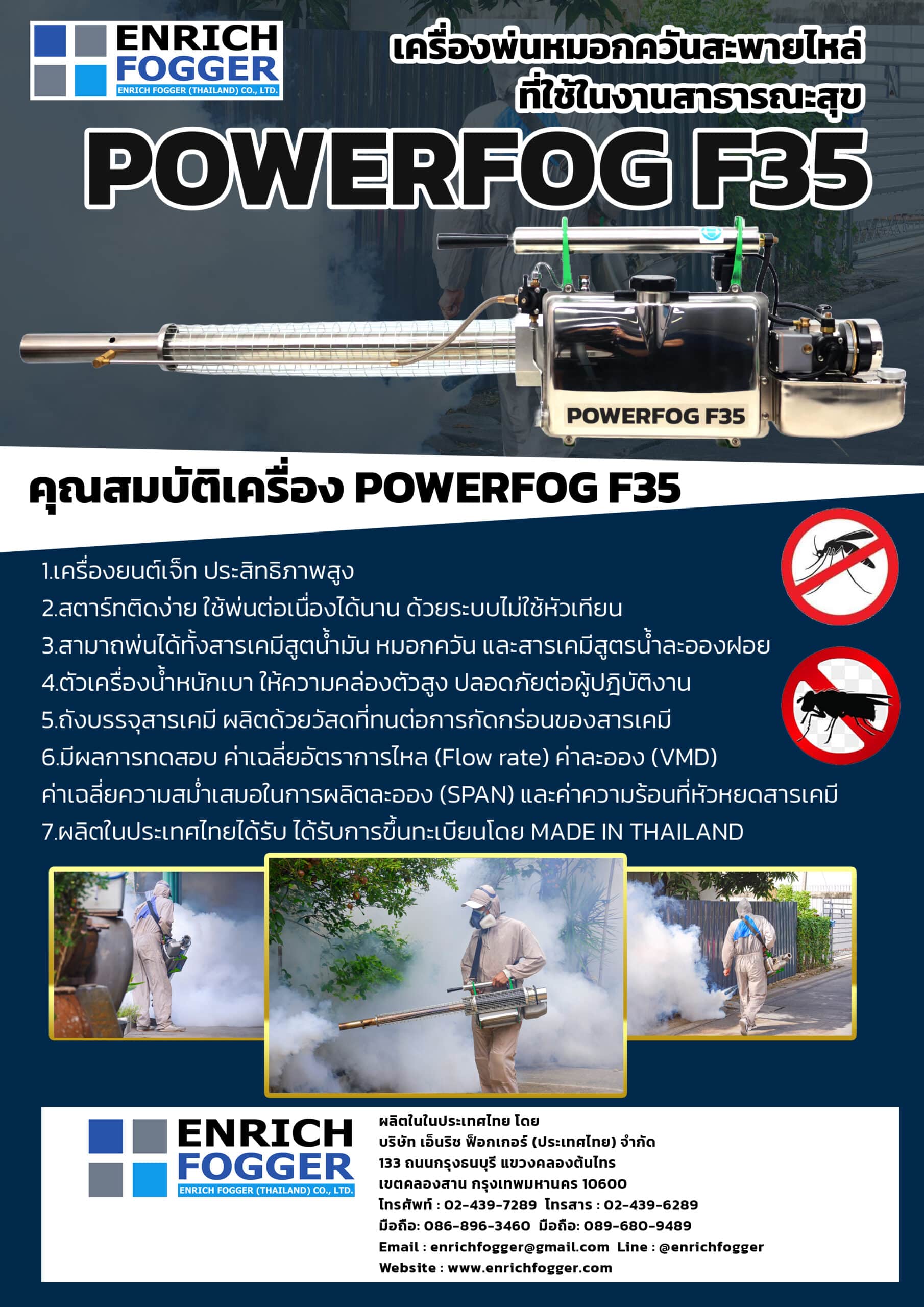 เครื่องพ่นหมอกควัน POWERFOG F35 สามารถพ่นหมอกควันได้อย่างรวดเร็วมีความสม่ำเสมอครอบคลุมพื้นที่ได้ไวและมีประสิทธิภาพ ทำให้เหมาะสำหรับการใช้งานในด้านสาธารณสุขเพื่อฉีดพ่นกำจัดยุง แมลง และพาหะนำโรคต่างๆ เครื่องพ่นหมอกควัน POWERFOG F35 ถูกออกแบบให้ใช้งานง่ายและไม่ยุ่งยาก แม้แต่ผู้ที่ไม่มีประสบการณ์ก็สามารถใช้งานได้ วัสดุที่ใช้ในการผลิตมีความทนทาน สามารถใช้งานได้ยาวนาน และมีน้ำหนักเบา ระบบการพ่นมีระบบคลีนสารเคมีออกจากท่อส่งสารเคมีก่อนดับเครื่องเพื่อไม่ให้มีสารเคมีตกค้างอยู่ในท่อส่งสารเคมีและยังสามารถดูแลบำรุงรักษาได้ง่ายโดยทางบริษัท บริษัท เอ็นริช ฟ็อกเกอร์ (ประเทศไทย) จำกัด จำกัด มีทีมช่างและผู้เชี่ยวชาญให้คำปรึกษาหลังการขายและมีอะไหล่ทุกชิ้นไว้คอยดูแลลูกค้าหลังการขายตลอดระยะเวลารับประกันและหลังหมดประกัน